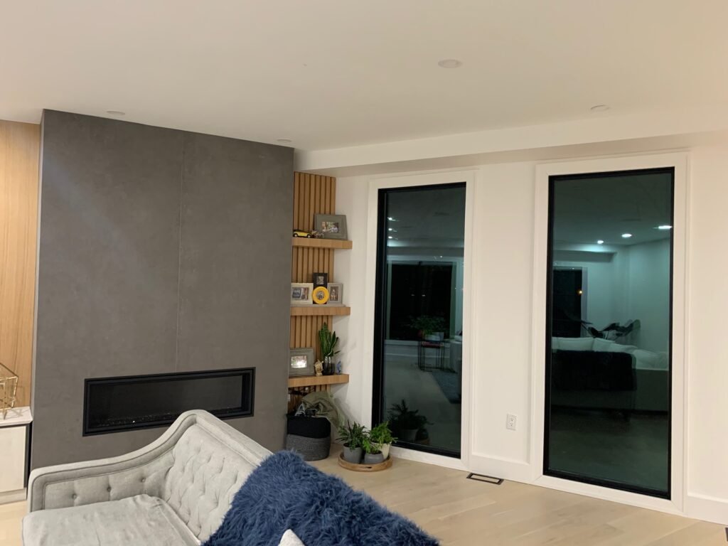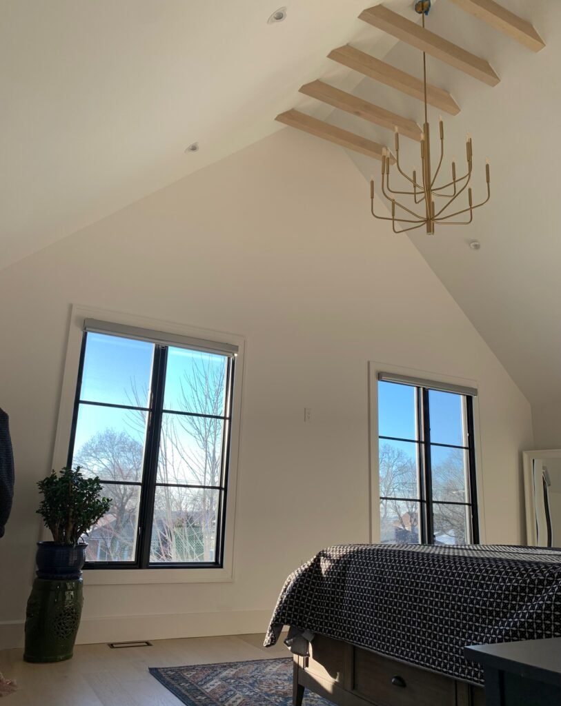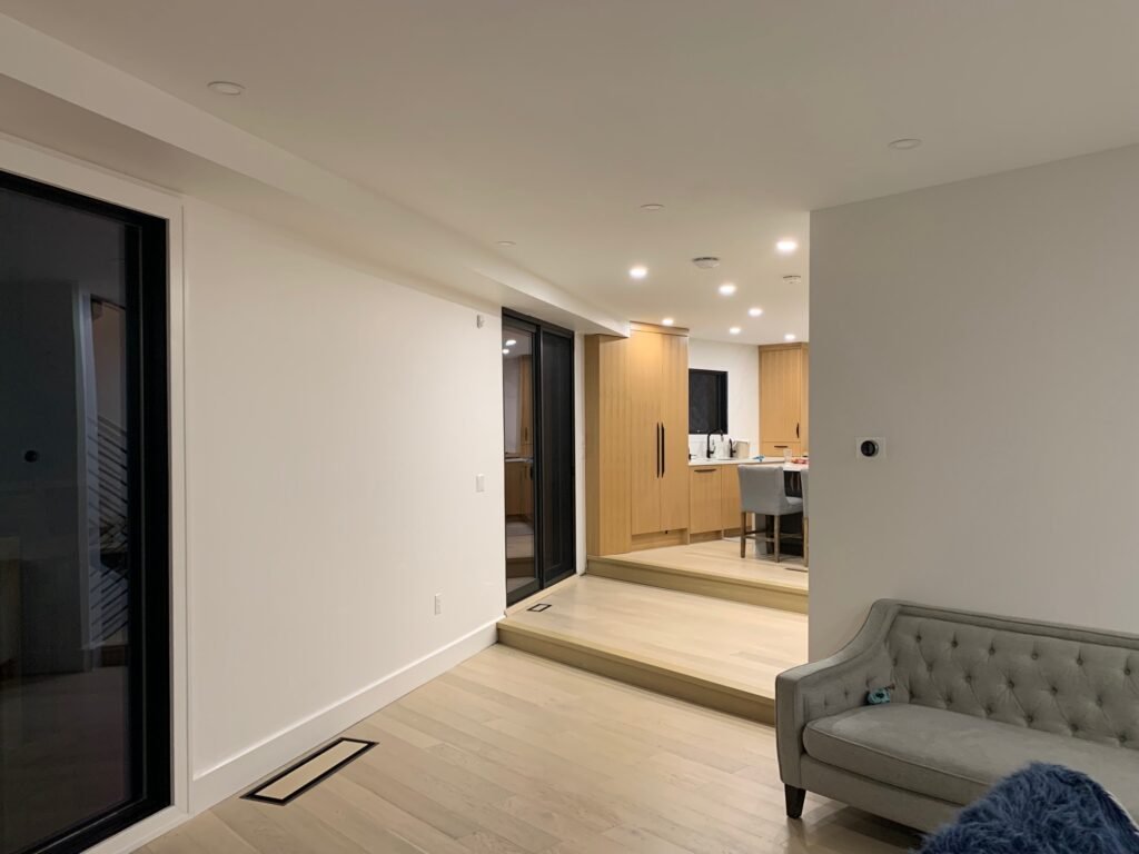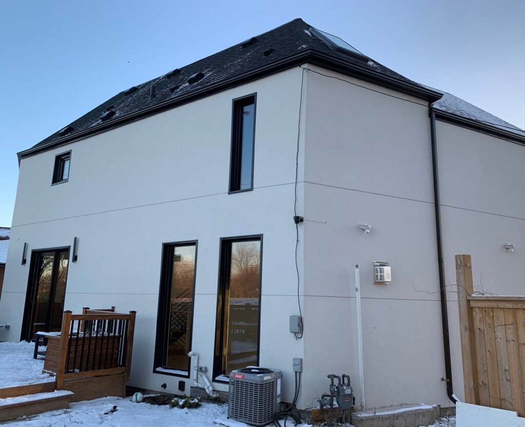 The existing 1500 sqft house located in Etobicoke was in desperate need of a major renovations as well as expansion. Our clients with their two small children were in need of expanding their existing spaces to better suite their evolving needs. The proposed addition slated for the north west corner of the existing house deemed to be the only viable solution for this odd pie shaped lot with Toronto Hydro easement at the rear. We secured the permit for the proposed location of the addition by presenting it to the City’s Committee of Adjustment to waive the existing minimum front yard zoning requirement. The basement expansion allows for the client to setup a work from home space while the ground floor allows for a much bigger living room and play space for the children. At the second floor of the addition the existing primary room was turned into a walk-in closet and an ensuite bathroom while the expanded area became the new primary bedroom with cathedral ceilings. The remaining existing areas were renovated with new fixtures, windows, millwork, lighting and HVAC system. Daylighting was improved by adding new large window openings for the common areas. The roof of the existing house was demolished so that the new roof would cover both the existing house and the addition to give the illusion of one singular structure without the hint of an addition which was further reinforced by use of stucco cladding for both the existing house as well as the addition.